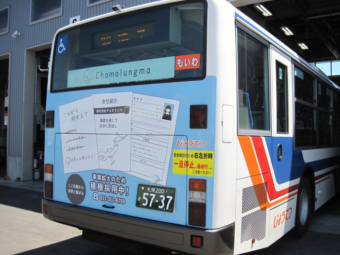 株式会社チョモランマのラッピング広告を載せたバスが、